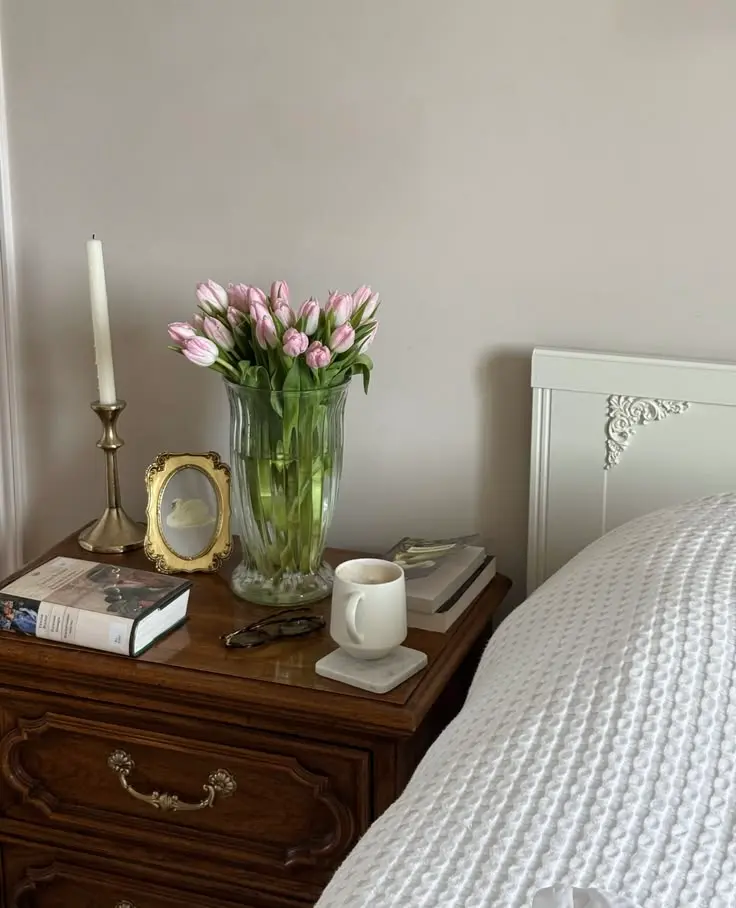 Nothing brightens and freshens a space quite like flowers. Keeping fresh blooms on your nightstand is both luxurious and beautiful. As a designer, I always try to incorporate plants or flowers—they add life, colour, and a sensory element to the room.